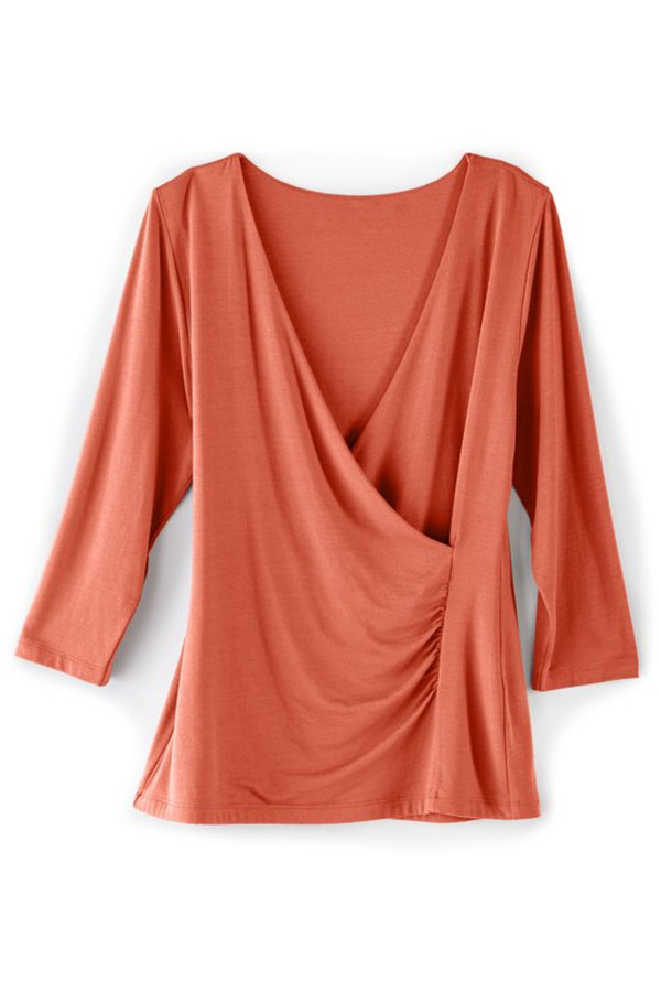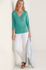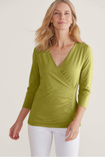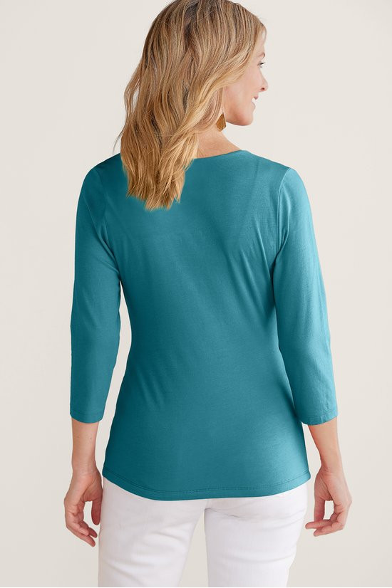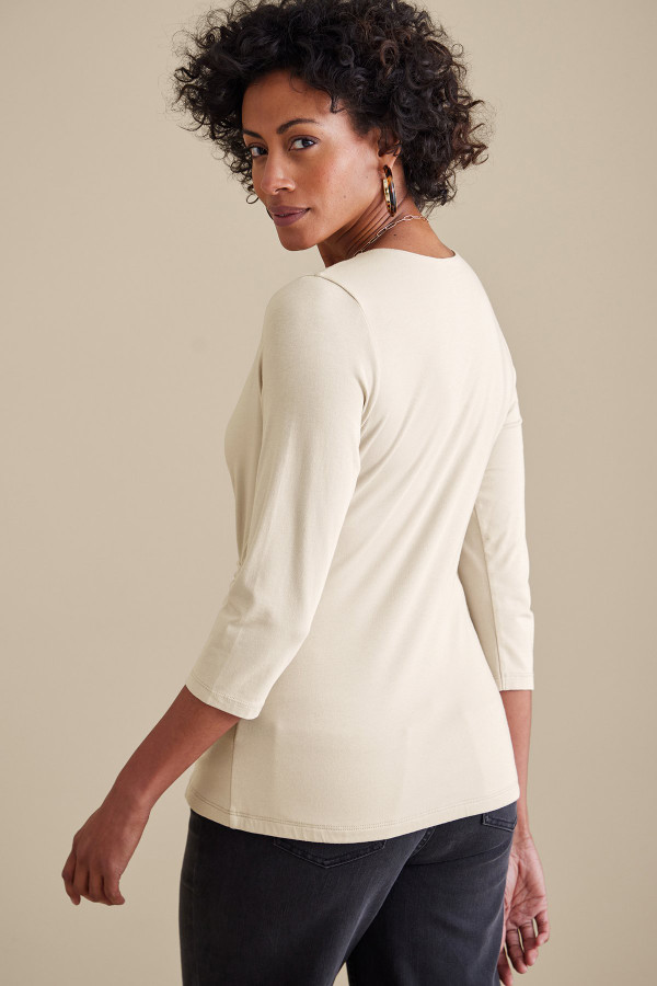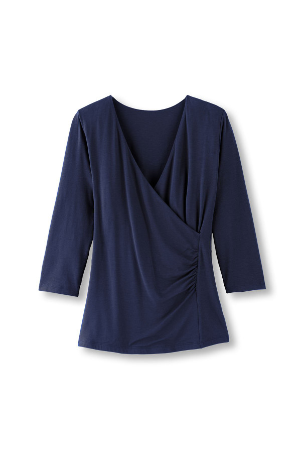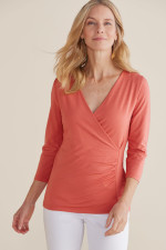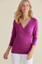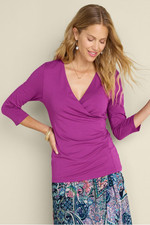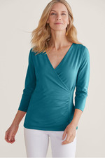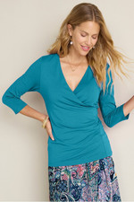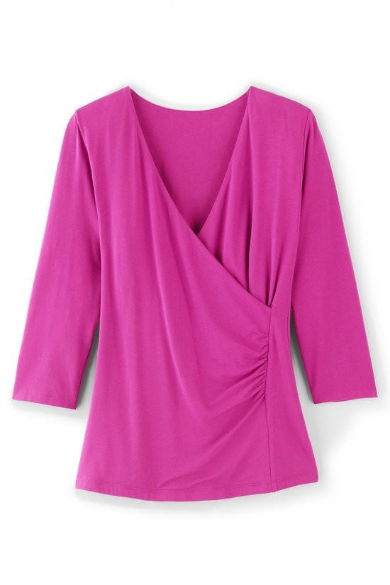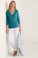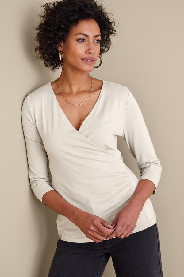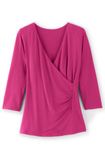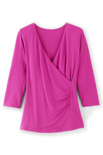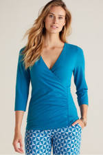 This fitted, 3/4-sleeve knit top features a two-layer bodice in a midweight Pima cotton blend. The surplice neckline and ruching detail create an easy, flattering silhouette that works well with both skirts and pants.