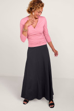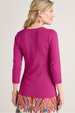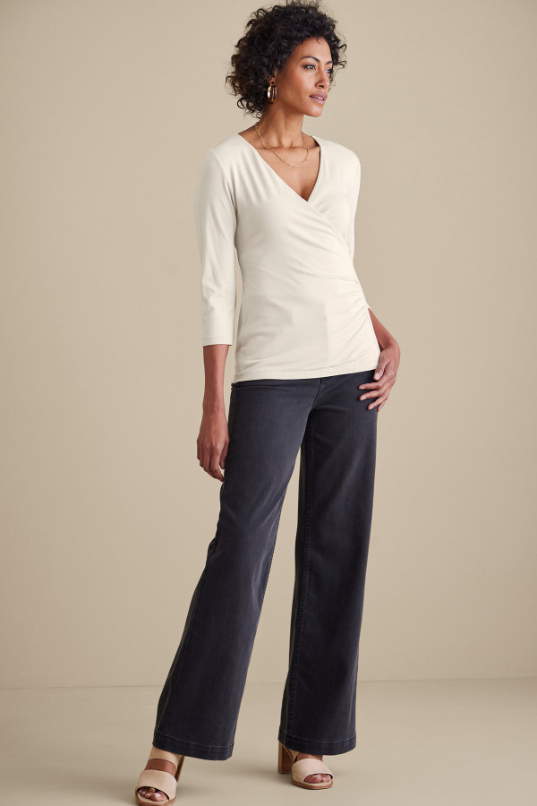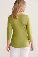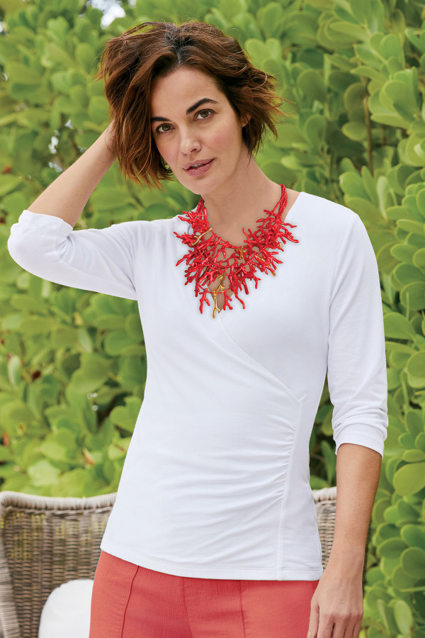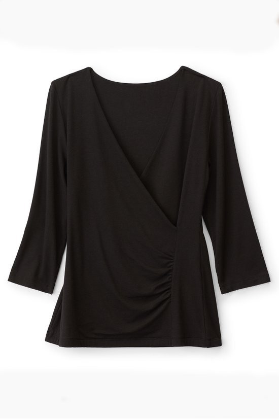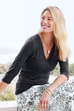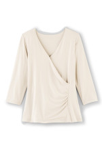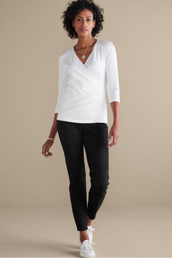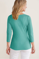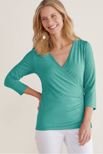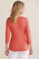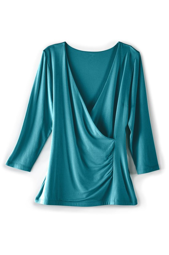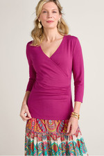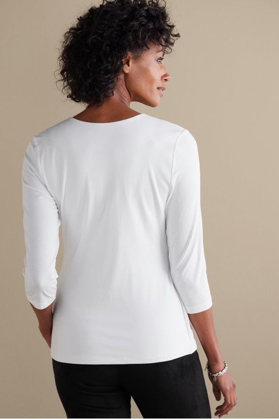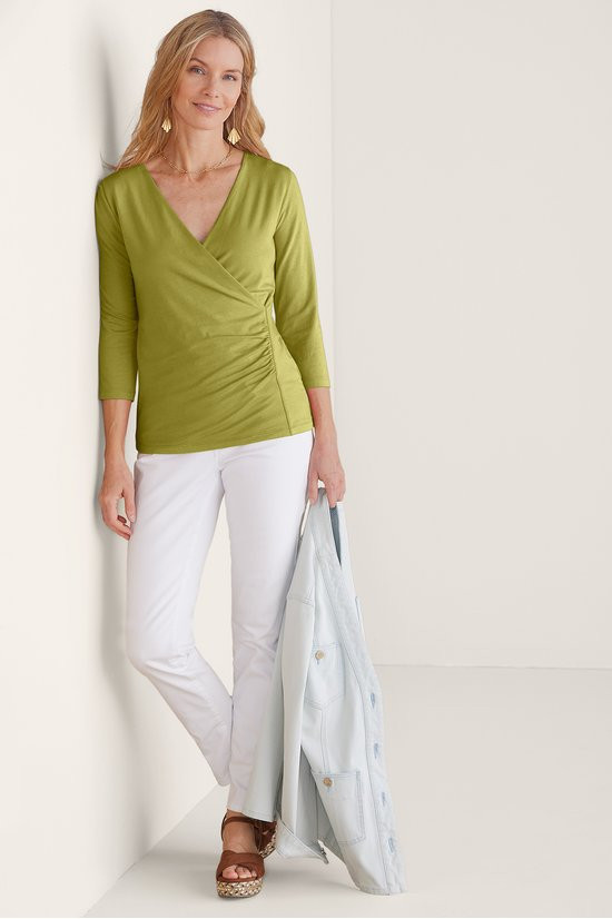 This fitted, 3/4-sleeve knit top features a two-layer bodice in a midweight Pima cotton blend. The surplice neckline and ruching detail create an easy, flattering silhouette that works well with both skirts and pants.