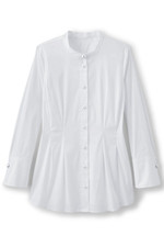 Pearls are dominating the style pages this season and this chic blouse leans into the trend with pearl buttons detailing the placket, plus oversized pearls accenting the mandarin collar and cuffs. Flip the deep cuffs for a dramatic, French cuff design. Pleats and darts give great shaping to the tunic length. Wear it untucked with a polished pant or velvet leggings.