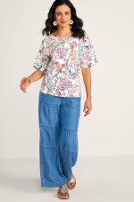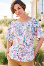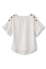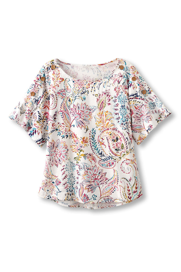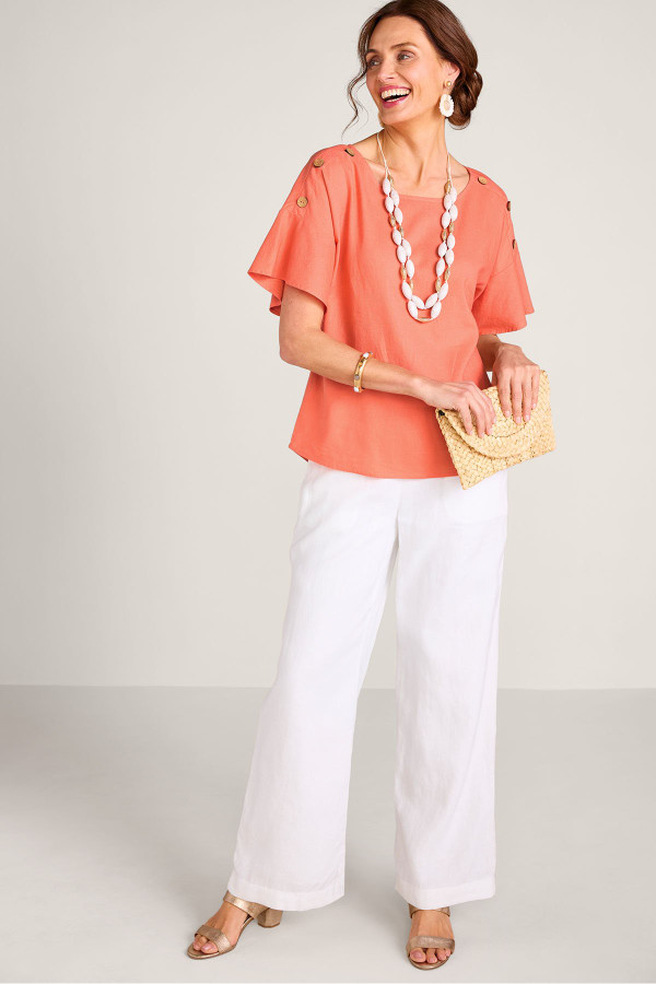 This pullover top features a breathable linen-viscose blend with button accents at the dropped shoulders. The boatneck and elbow sleeves create relaxed styling while a high-low curved hem adds versatile shaping.