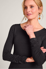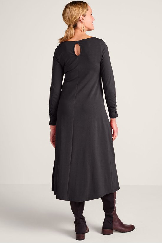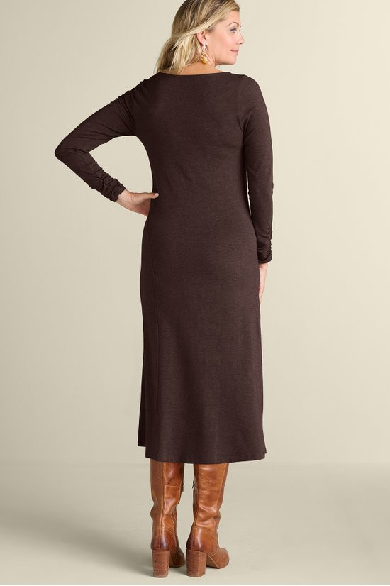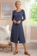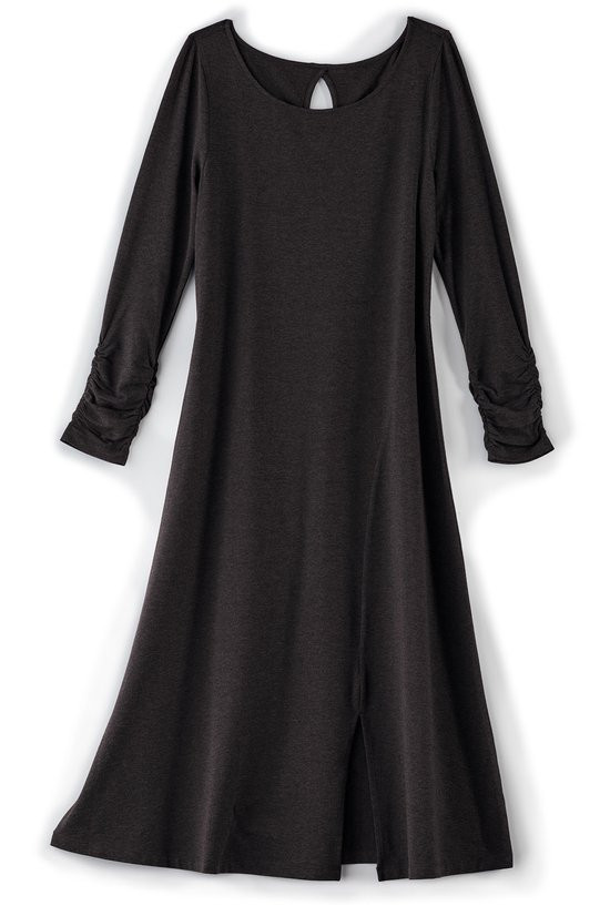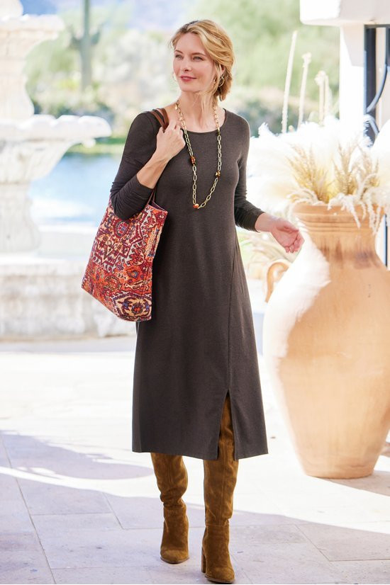 Designed to flatter, destined to become a favorite. Easy knit dress is cut to follow your curves with a deep front slit that gives it extra swing. The boatneck shows off your collarbone. Shirred long sleeves.