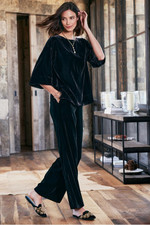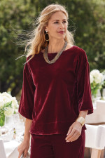 The liquid drape. The easy shape. Everything about this modern boatneck top is magic, all in the softest velvet you've ever felt. We love it paired with our Aria Velvet Wide Leg Pants (2FZ90), but it's also effortless with flared jeans. Side slits.