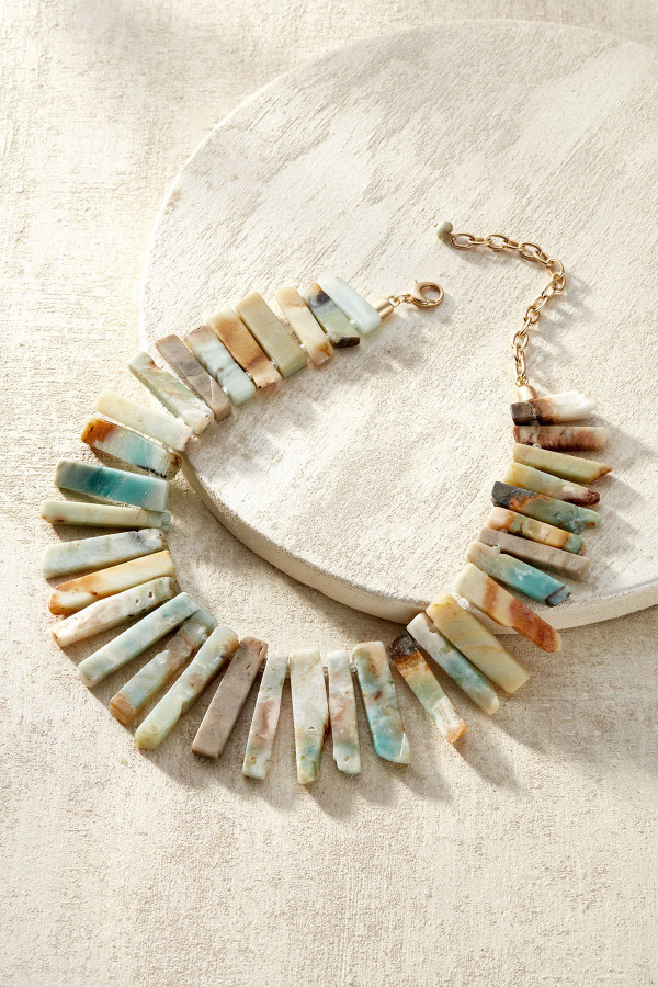 This necklace features genuine amazonite and jasper stones that channel calming energy. Each stone is unique and will vary, and it comes in a velvet bag for safekeeping. Claw closure.