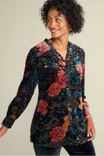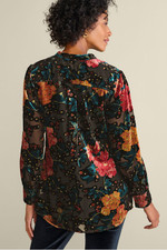 Evening ready, its vibrant florals bloom from midnight-black burnout velvet flecked with gold. And with an included knit tank, you never have to worry about show-through when your dinner guests are admiring your better-than-a-bouquet button-front.