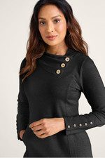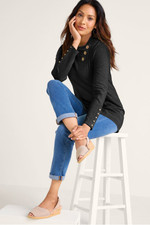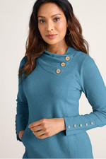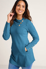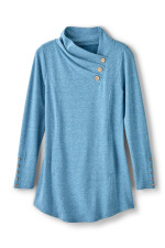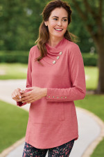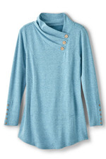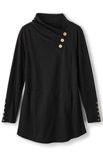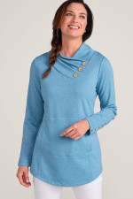 This French terry tunic in soft midweight fabric brings comfort and style with a pleated, buttoned crossover neckline. Princess seams, button-trimmed long sleeves, and curved hem add refined detailing, while the kangaroo pocket offers practical comfort.