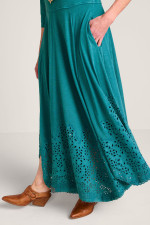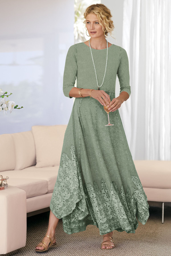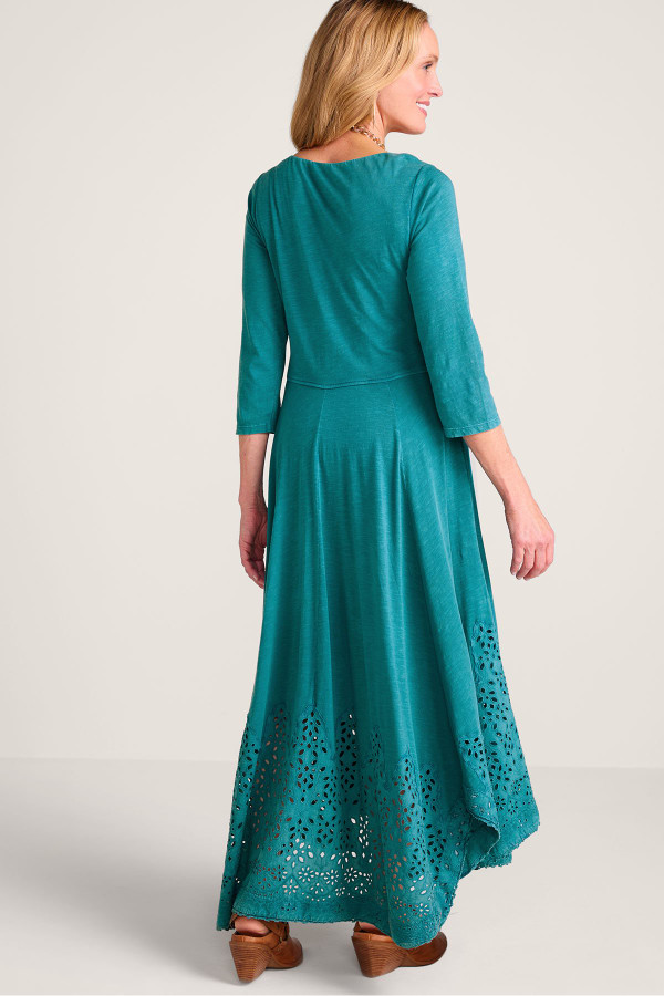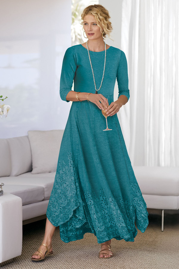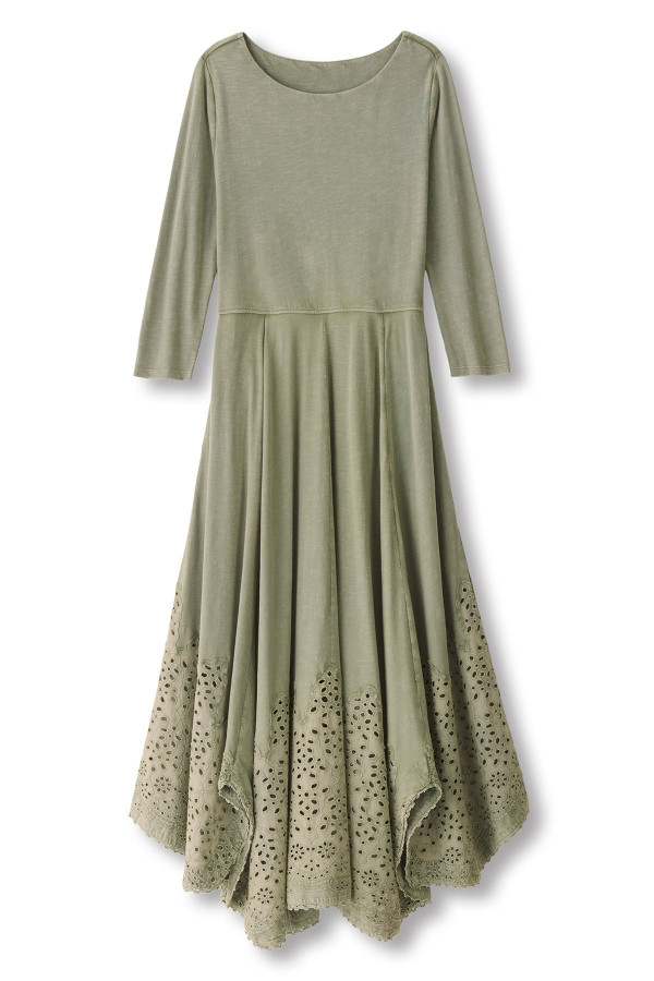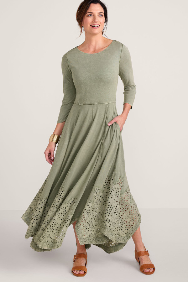 This 3/4-sleeve dress in soft-washed midweight cotton slub knit features embroidered and eyelet details at the lace-trimmed handkerchief hem. The boatneck and two-layer bodice complement the flattering silhouette, while pockets add a thoughtful touch.