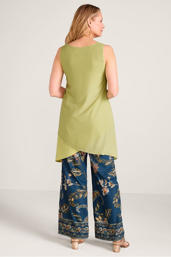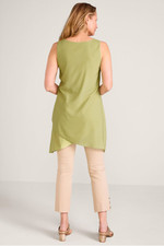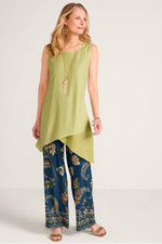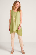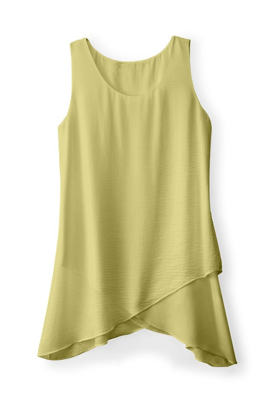 A new angle on the must-have tank finds swingy asymmetrical layers criss-crossing with irresistible flair. Scoop neck.
