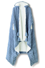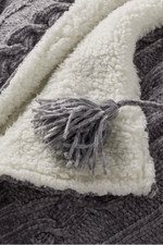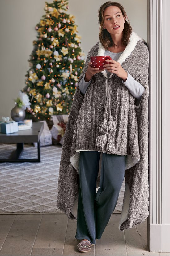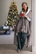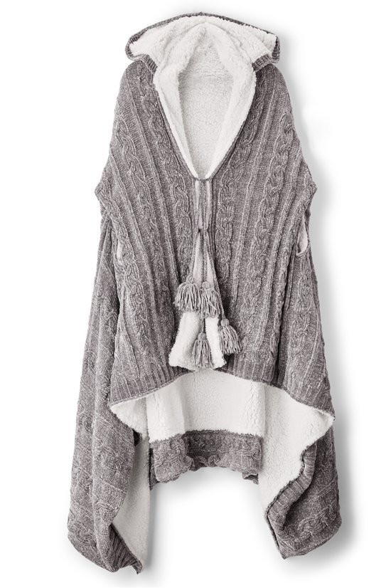 Our wearable throw in velvety cable knit chenille has convenient armholes, two tasseled front tie closures and a hood. Completely lined in soft faux shearling, it's the perfect top layer for staying warm indoors or out.