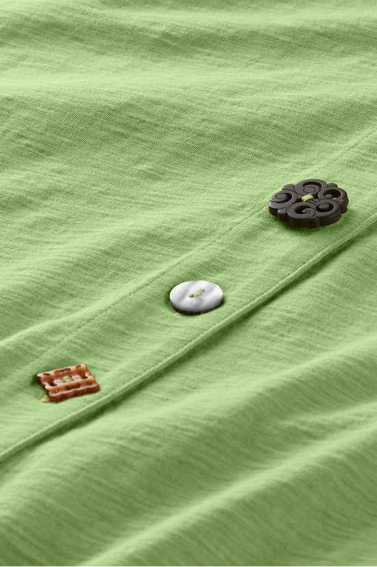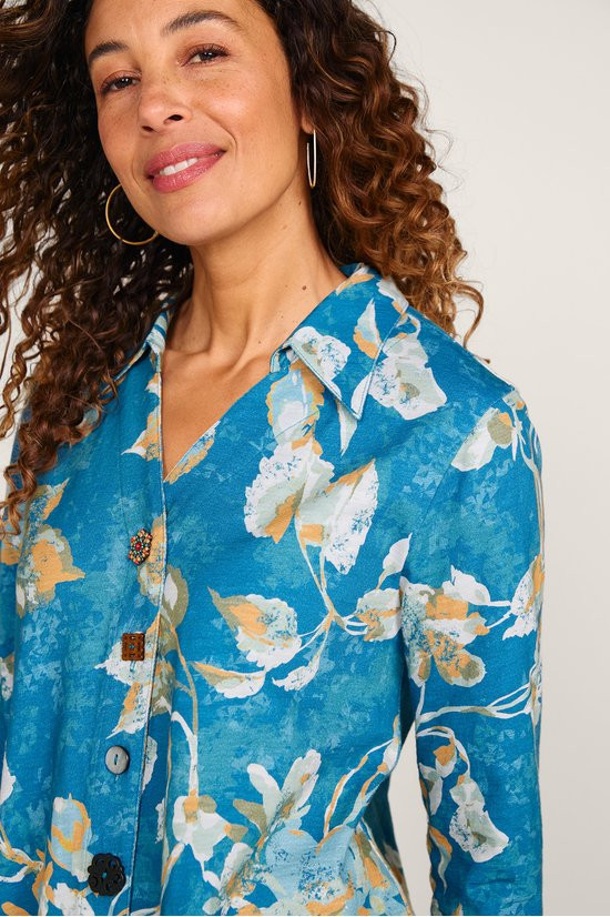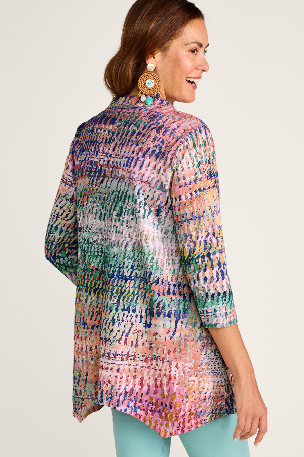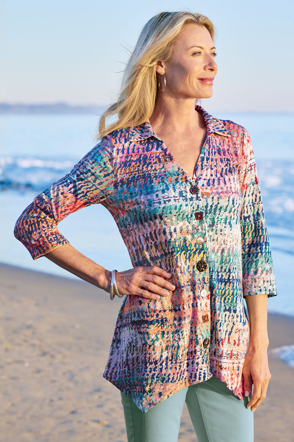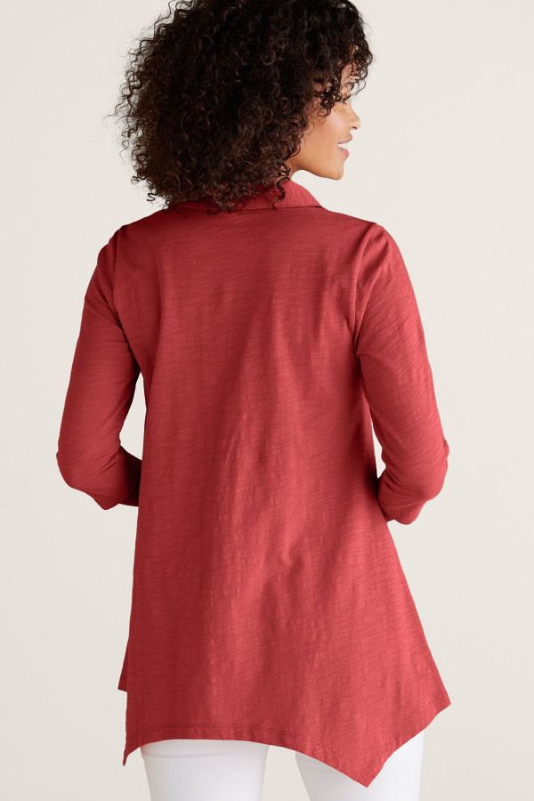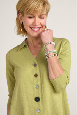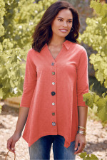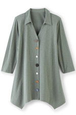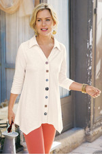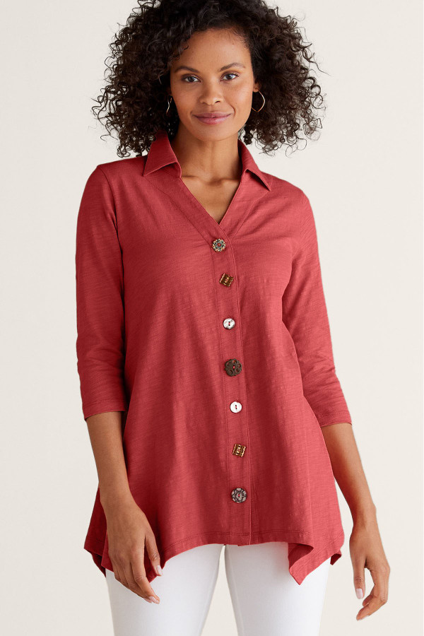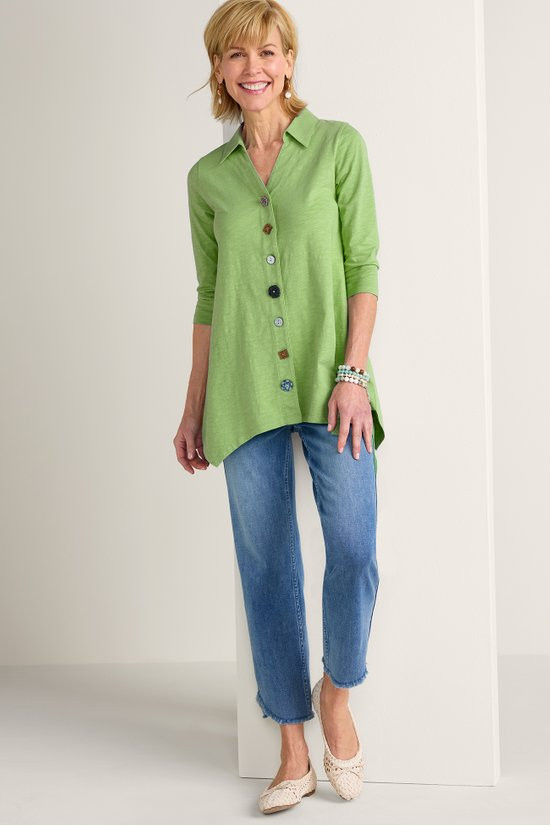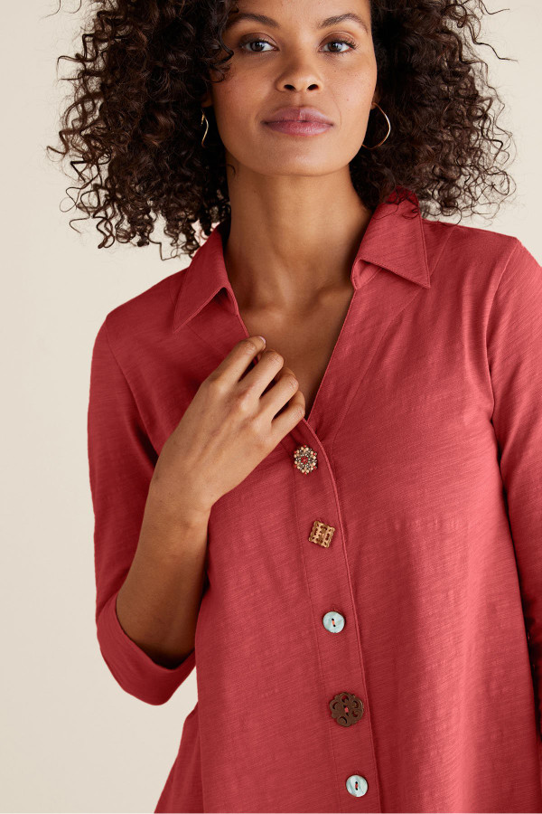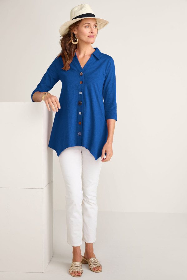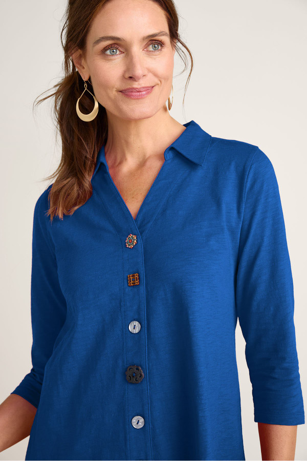 This 3/4-sleeve tunic in soft, midweight cotton slub knit drapes from shirt collar to shark bite hem. Our signature mix of buttons adds distinctive character to this versatile style.