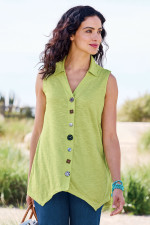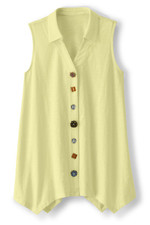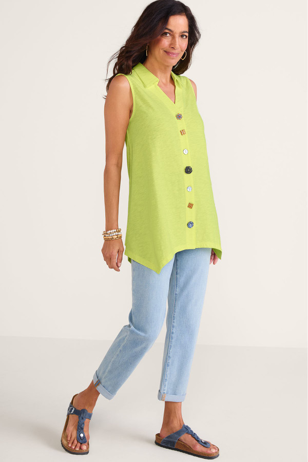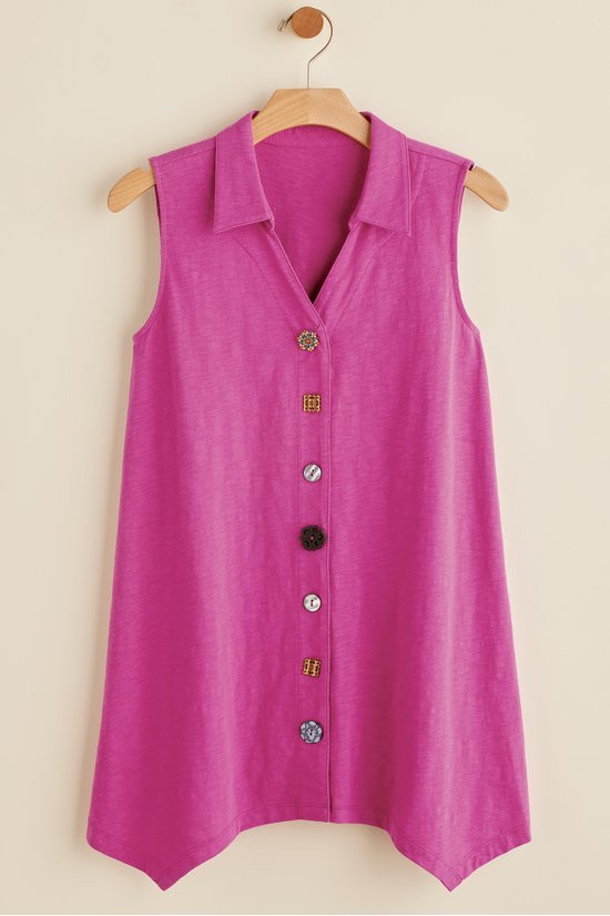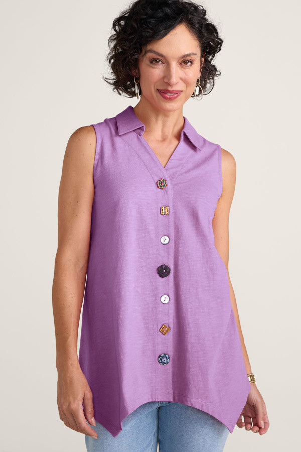 This sleeveless tunic features soft midweight cotton slub knit that drapes from collar to shark bite hem. A signature mix of buttons creates artful detail down the front while the sleeveless design offers easy layering. Natural slub texture adds visual interest to this versatile style.