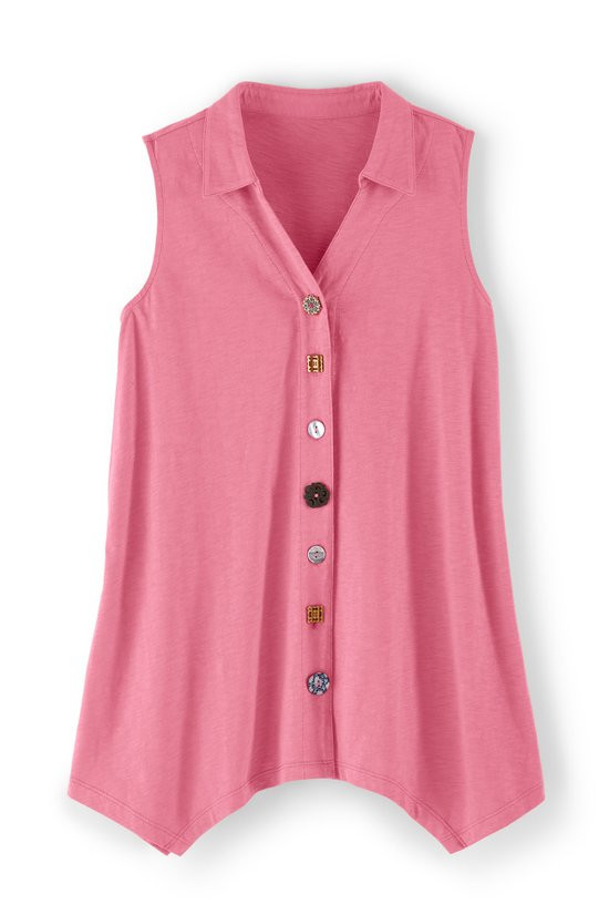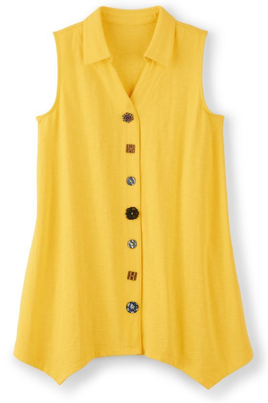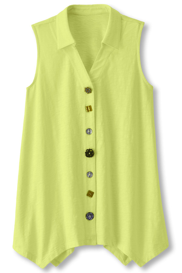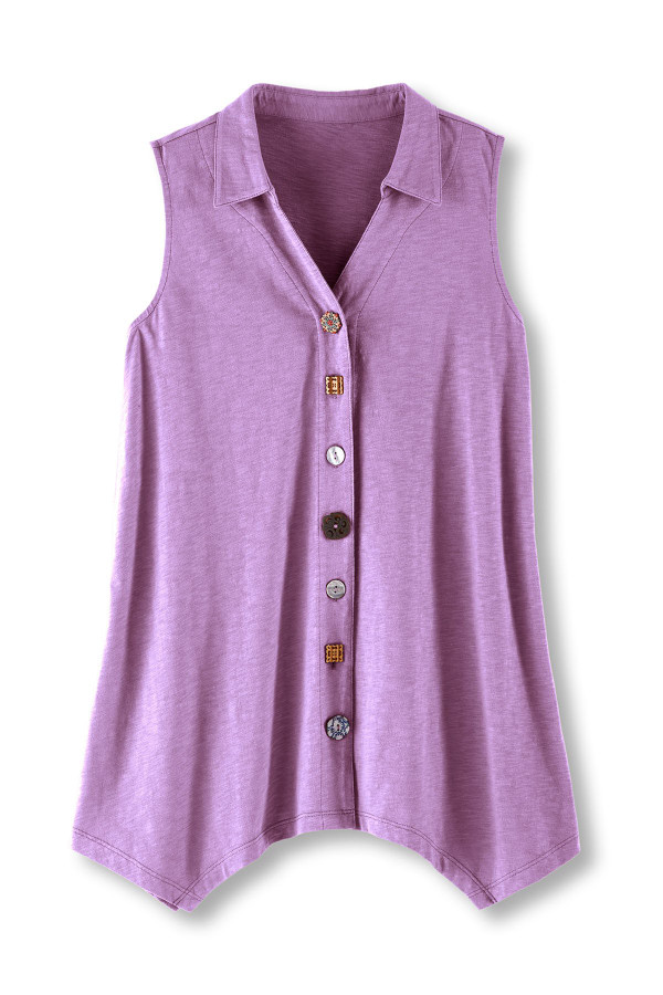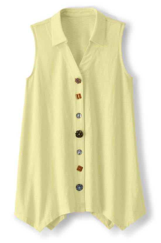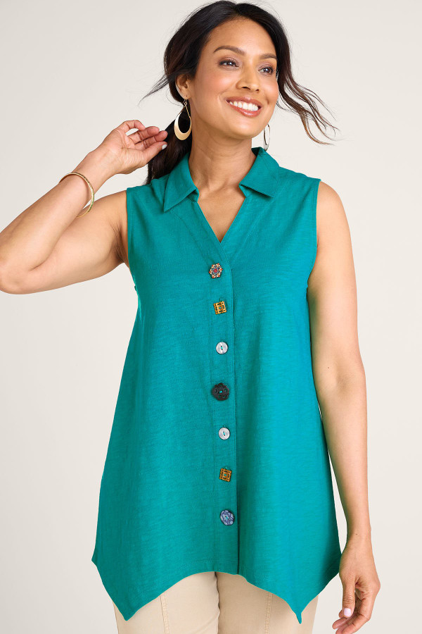 This sleeveless tunic features soft midweight cotton slub knit that drapes from collar to shark bite hem. A signature mix of buttons creates artful detail down the front while the sleeveless design offers easy layering. Natural slub texture adds visual interest to this versatile style.