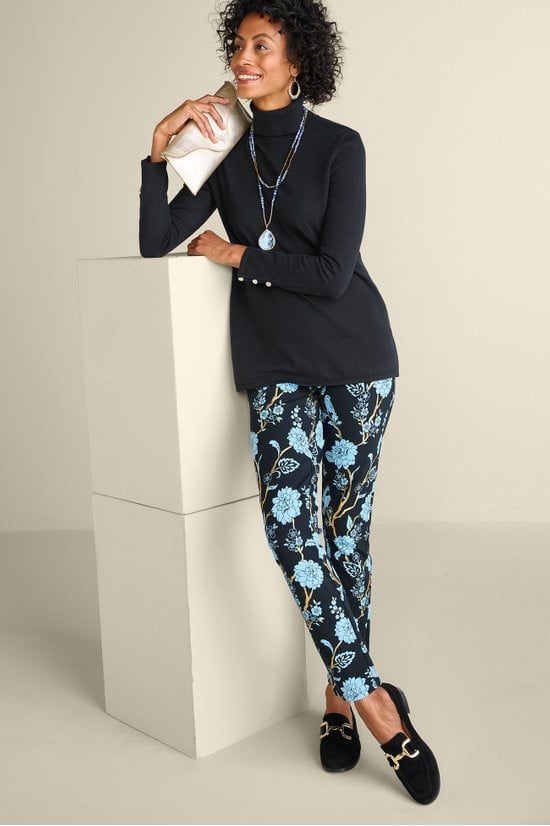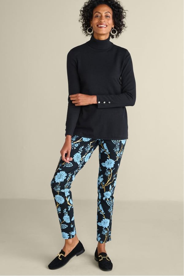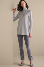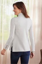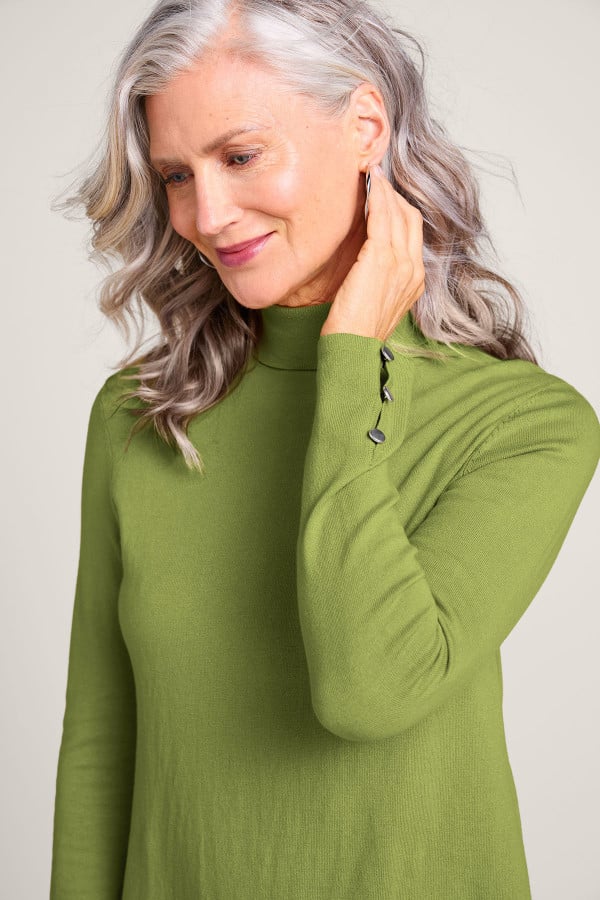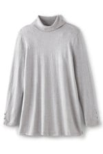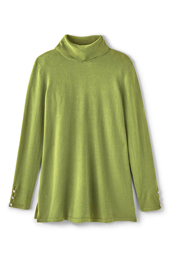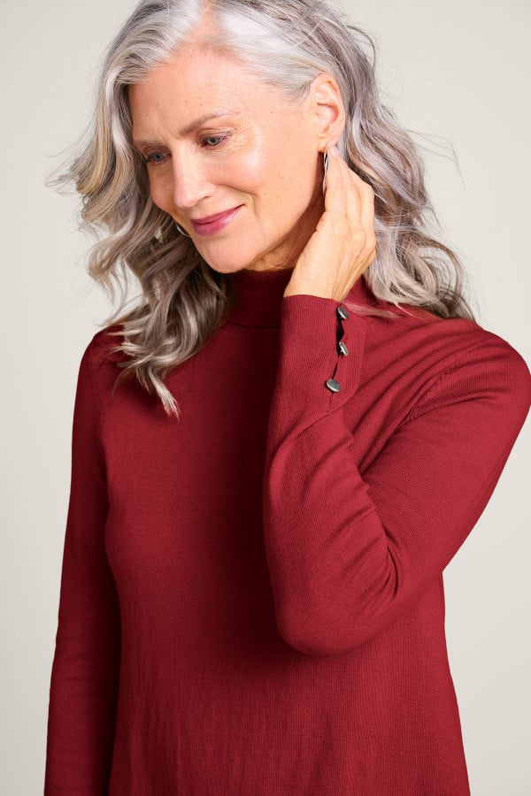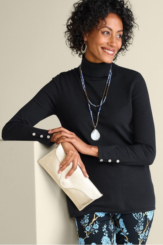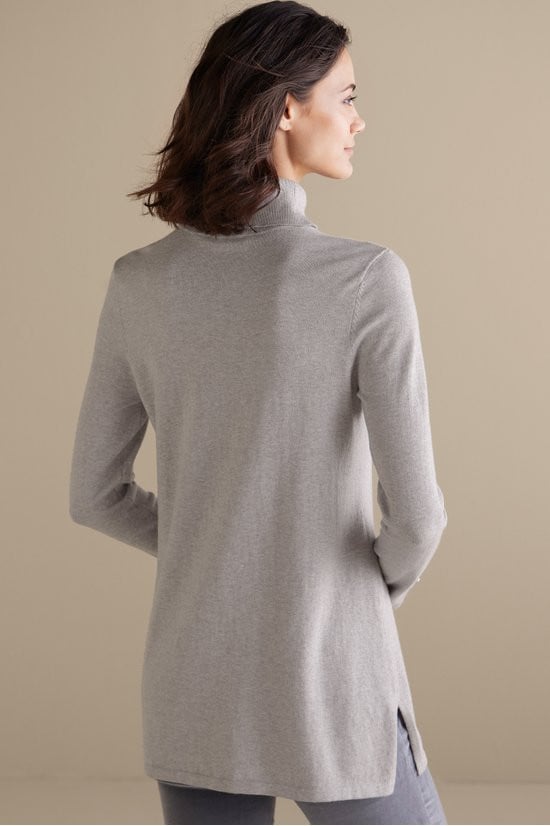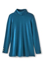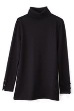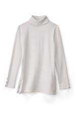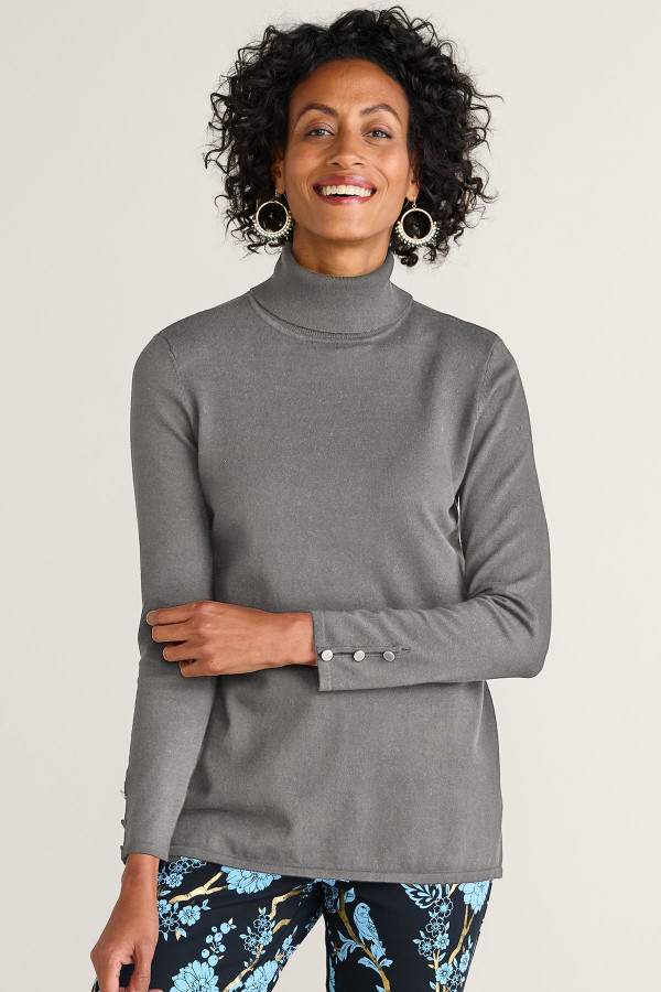 Slit sleeves with button detailing update your new favorite turtleneck sweater. Easy silhouette with side slits.