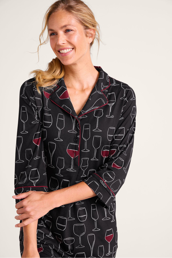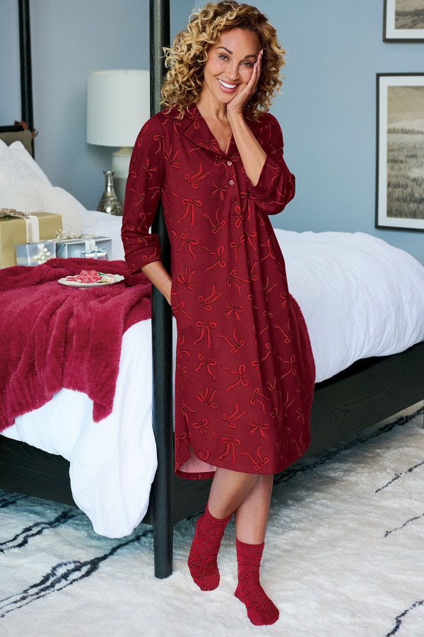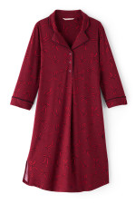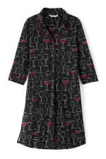 This soft-as-ever peached knit nightshirt is printed to match your personality. Featuring a collar, partial button placket, high-low shirttail hem with side slits and contrast binding. Finished with 3/4 sleeves, pockets and knee-length coverage for comfortable sleep style.