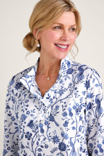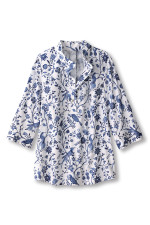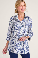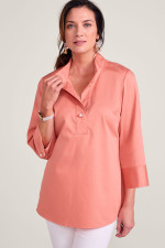 This 3/4-sleeve stretch woven popover offers effortless style with wrinkle-resistant fabric. Pearl buttons accent the half-placket and sleeve cuffs, while an inverted back pleat adds refined detailing.