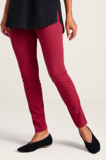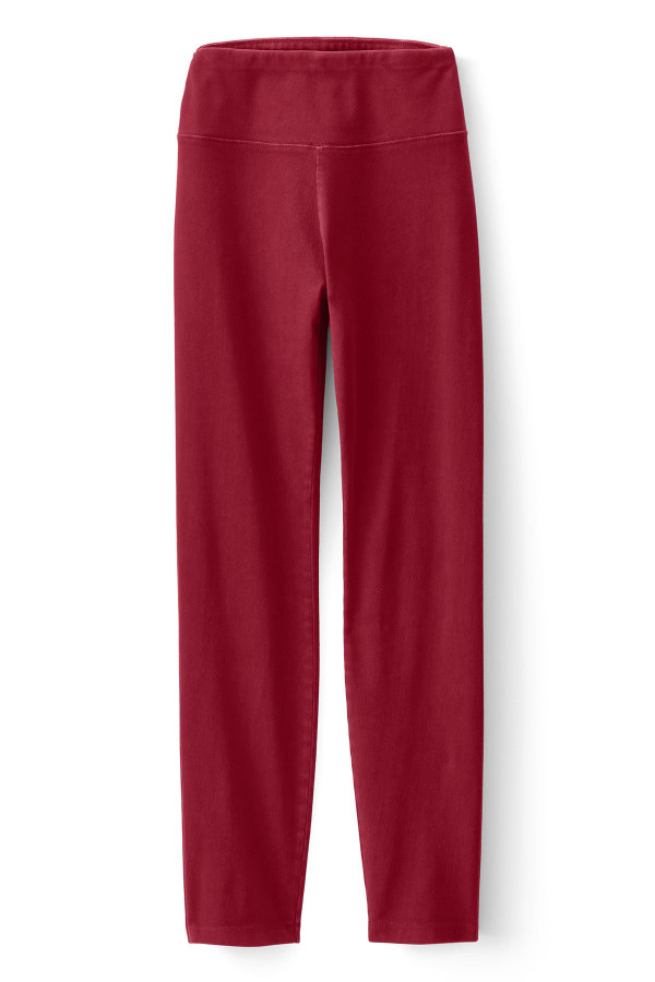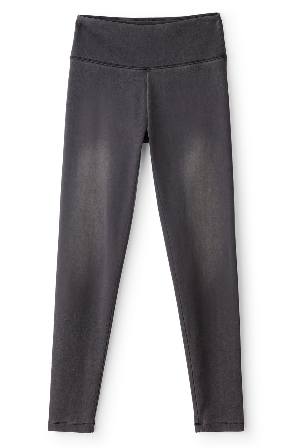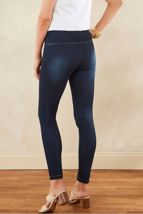 These stretch-knit, ankle-length leggings offer superior pull-on comfort with a smoothing waist panel for subtle shaping. The soft knit fabric provides ease of wear with the look of jeans in an authentic denim wash.