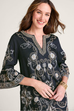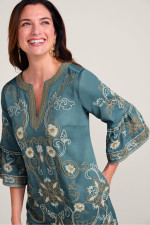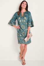This shift dress in midweight twill features floral embroidery flowing from the split neckline through the 3/4 flounce sleeves to the knee-length hem. Side pockets add convenience while the straight silhouette offers comfortable ease. Perfect for special occasions or dressed-up daytime events.