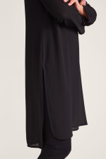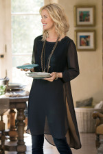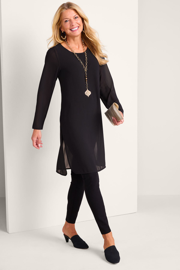 Bring the drama in sheer chiffon elegance, gracefully skimming the knee with its side-slit high-low hem. Pair with black pants for a head-to-toe ebony ensemble. Lined body for extra coverage.