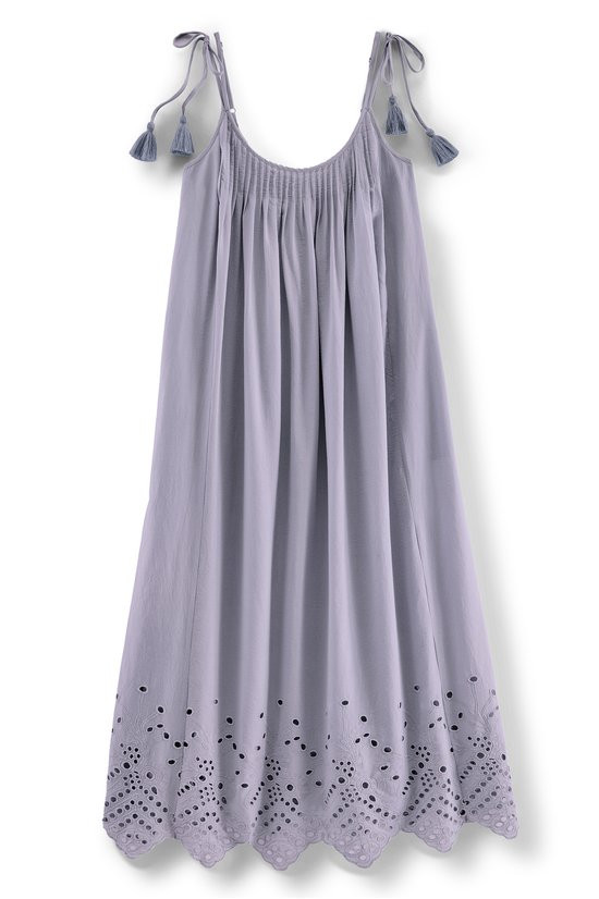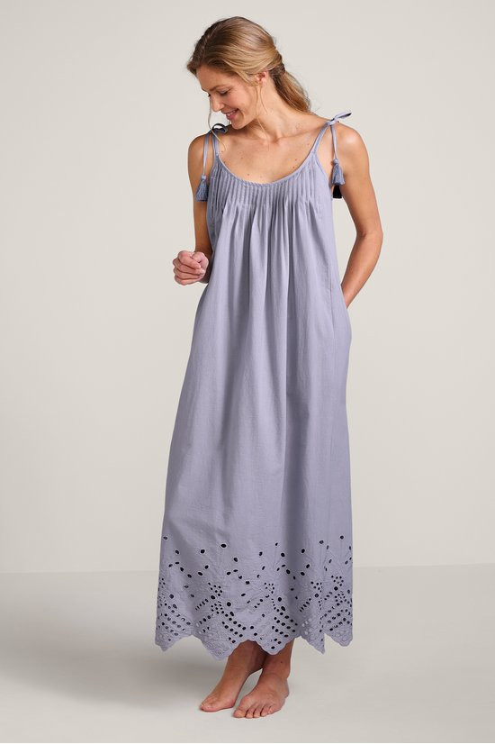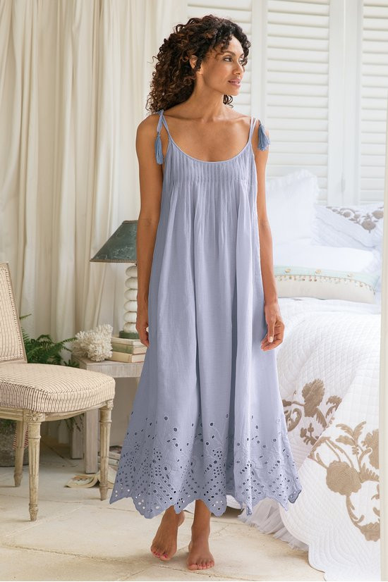 This sleeveless, maxi-length nightgown features soft cotton voile with pintucks releasing to a flowing silhouette. Adjustable slider and tassel-tie straps ensure a customized fit while eyelet and scallop details at the hem add feminine finishing touches. On-seam pockets provide convenience.