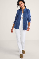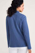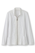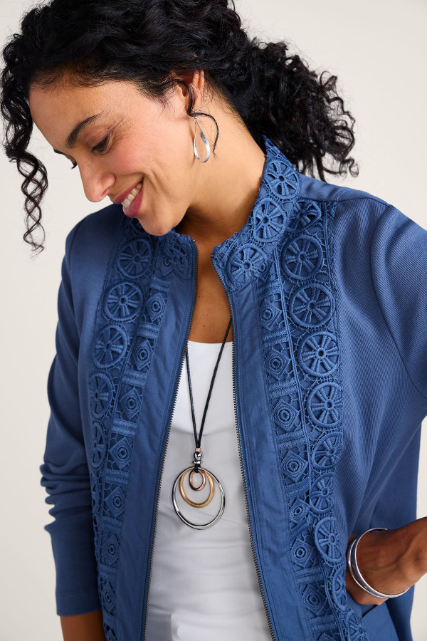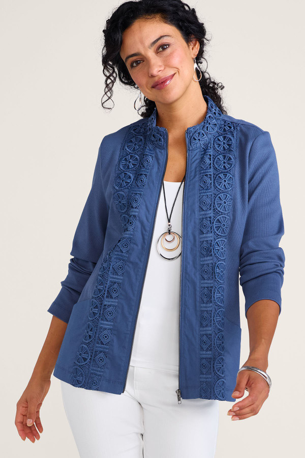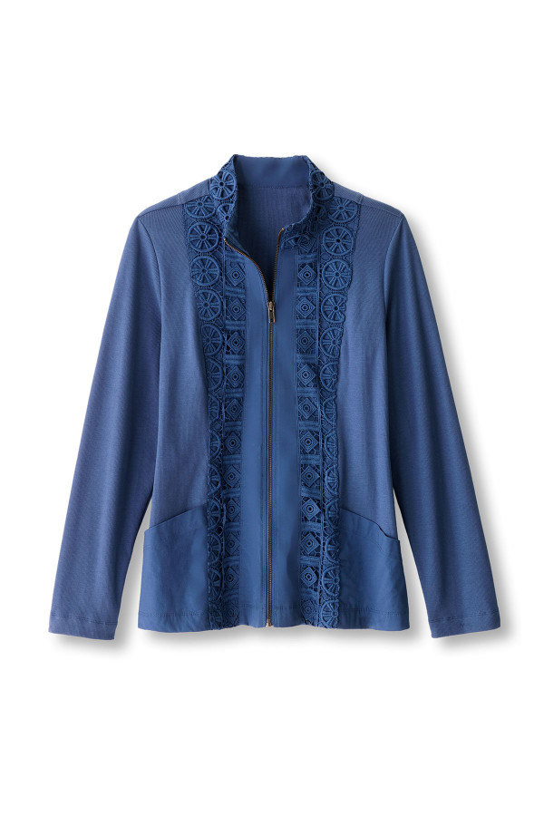 This fitted ribbed knit jacket combines crochet lace and poplin accents for textured dimension. A stand collar adds refined detail, the zip front allows for easy layering and pockets add convenience. The cotton/spandex blend offers comfortable stretch in a versatile style.