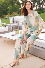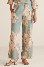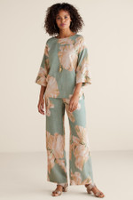These wide-leg pants in a lightweight lyocell/linen blend showcase an oversized botanical print. The elastic waistband ensures a comfortable fit at your natural waist, while the drapey fabric and wide-leg silhouette create flowing movement. Coordinates beautifully with the matching Fleur Top (Style 2FP36) or mix with solid tops for versatile styling.