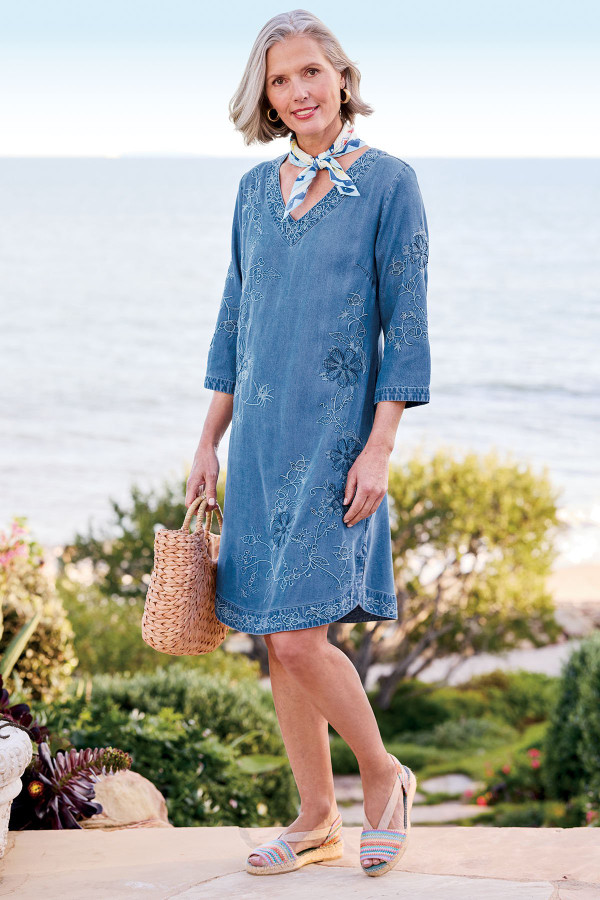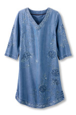 This knee-length dress features soft, drapey TENCEL™ lyocell accented with tonal embroidery in artfully mixed patterns. The breathable fabric offers comfortable movement while 3/4 sleeves and side slits add versatile styling. A refined choice that balances casual ease with artisan detail. TENCEL™ is a trademark of Lenzing AG.