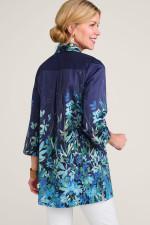 This 3/4-sleeve long tunic in stretch sateen features a blooming print flowing upwards throughout the design. The button placket, shirt collar, and mid-thigh curved hem create artful character in a flattering silhouette.