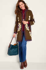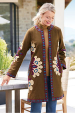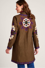 A long cotton twill jacket that makes an artful statement. Uniquely embroidered with vintage-inspired florals cascading from the stand collar to the mid-thigh hem, this softly structured piece showcases exceptional attention to detail. The thoughtful design includes a hook-and-eye closure, practical pockets, side slits for movement, and a full jacquard lining that adds luxe comfort.