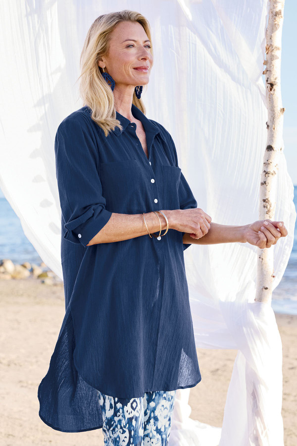 This extra-long, lightweight tunic offers versatile styling options - wear buttoned, unbuttoned or tied at the front. The dramatic high-low length creates statement appeal while the breathable cotton gauze fabric provides comfortable movement. A relaxed silhouette with 3/4 button-cuff sleeves and chest pockets for added convenience.