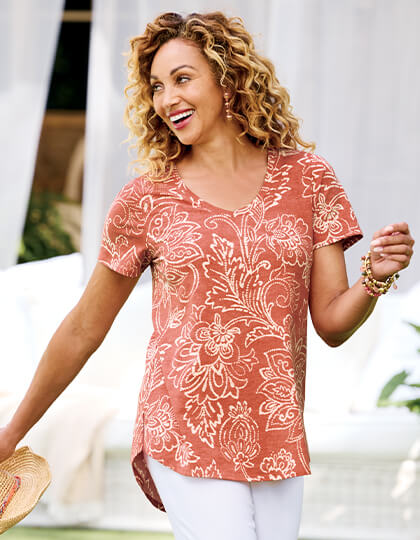 This slub knit tunic features a crinkled chiffon ruffle at the tulip hem for feminine detail. A V-neckline and 3/4 sleeves create versatile styling that works across seasons. The cotton/modal body provides comfortable ease while the hem adds visual interest. An elevated basic that transitions from casual to dressy.