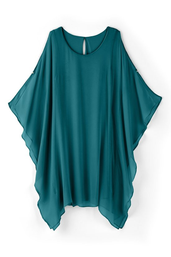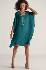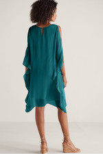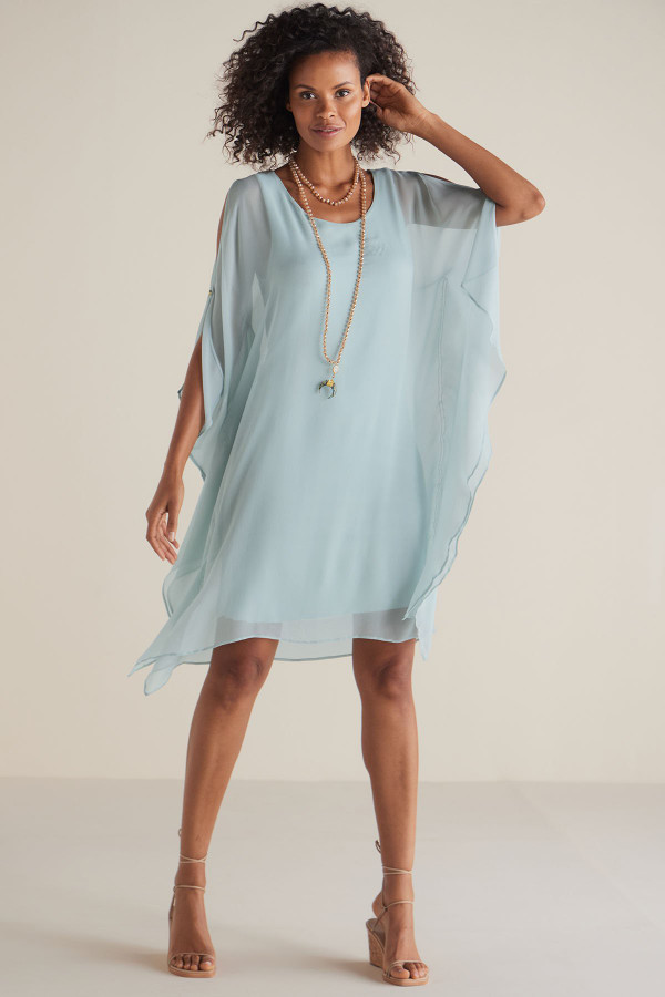 Special occasion silk dress features flowing chiffon that drapes over a softly structured knit sheath creating elegant movement and distinction. Button-closure slit sleeves and a back keyhole button closure add refined detail. The relaxed fit is easy to wear, making the design an ideal wedding-guest dress and for events with a more formal dress code.