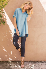 This short-sleeve shirt in midweight TENCEL™ lyocell drapes softly and moves beautifully. A shirt collar, dolman sleeves and high-low curved hem create a relaxed silhouette. The fabric offers natural breathability and comfortable drape perfect for warm days. Multiple styling options make this work from casual to dressy. TENCEL™ is a trademark of Lenzing AG.