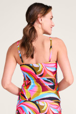 Awash in color, this demi-scoop tankini top is both fun and flattering. With supportive underwire, cups you can choose to remove and adjustable straps for the just-right fit. Gold-tone beads glimmer at the shirred bust. Bottom sold separately, 2GN62.