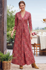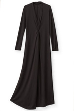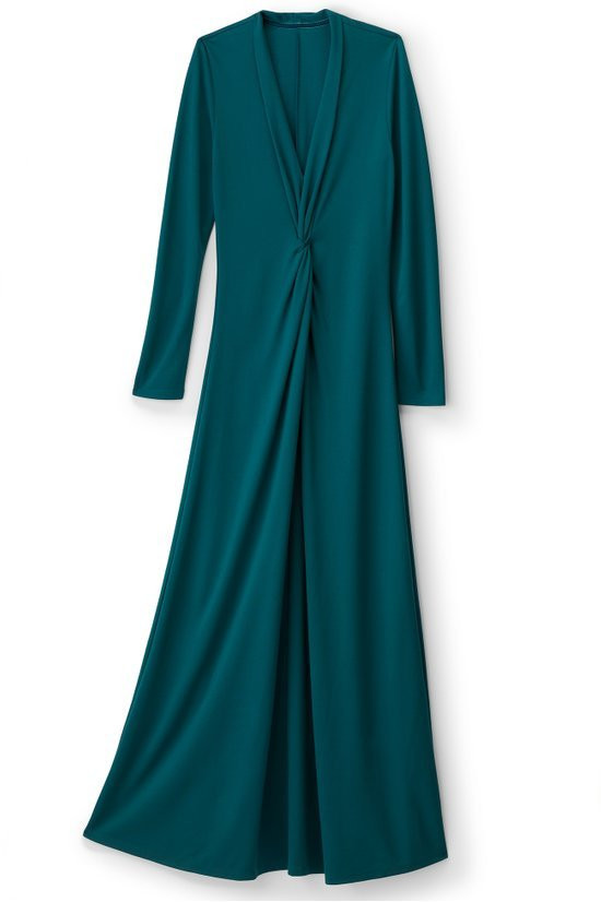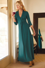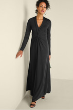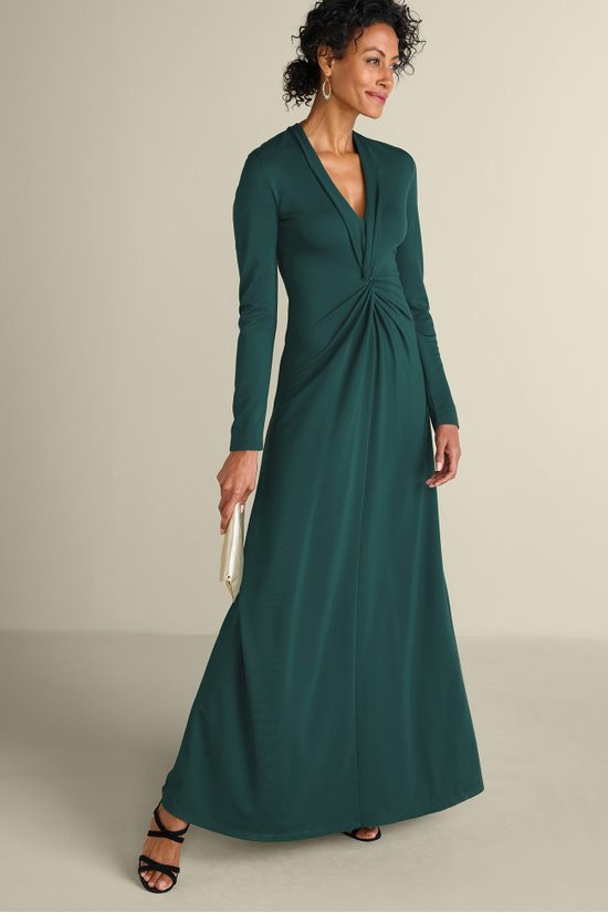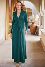 An amazing silhouette with center front twist and contoured ruching from V-neck to full sweep, in versatile ponte knit.