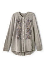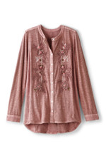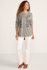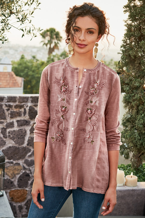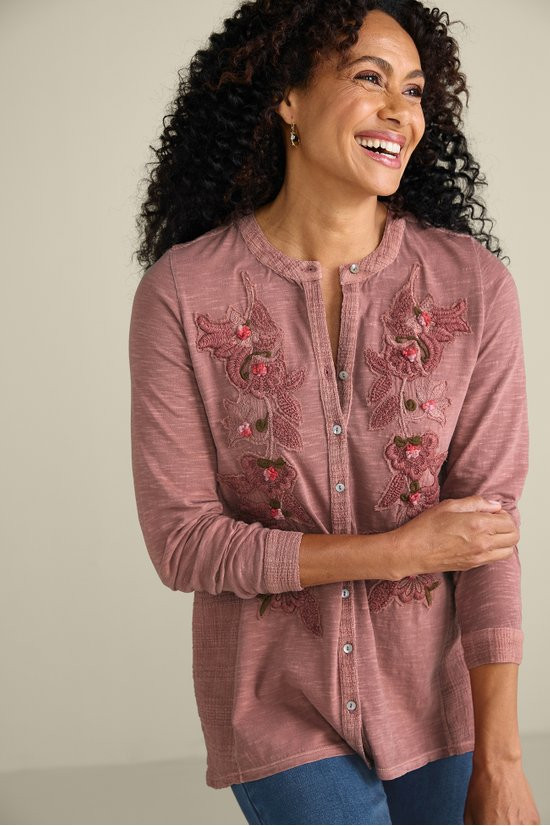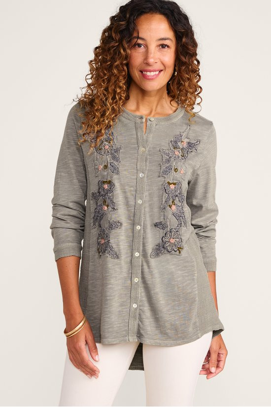 Amazing details update your essential fall top in a lively mix of knit and woven cotton. Embroidered flowers trail down the button front. Contrast windowpane dobby defines the back yoke and dramatic, shirttail hem with a deep slit.
