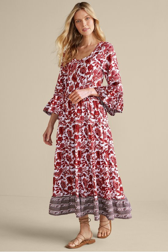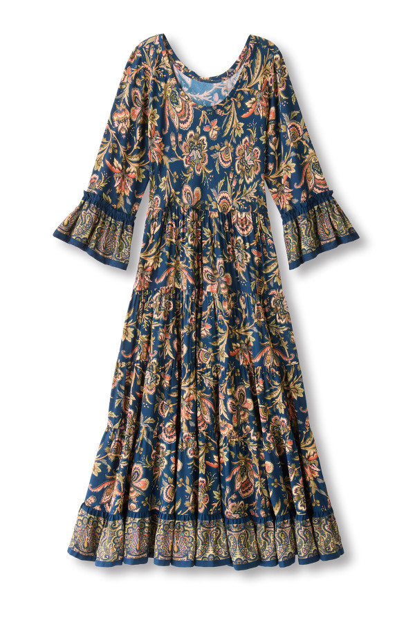 This midi dress in lightweight rayon challis flows in soft tiers with a detailed floral print. The scoop neck and 3/4 flounce sleeves add feminine detailing to its easy style.