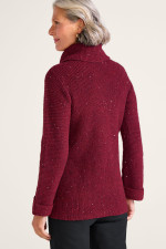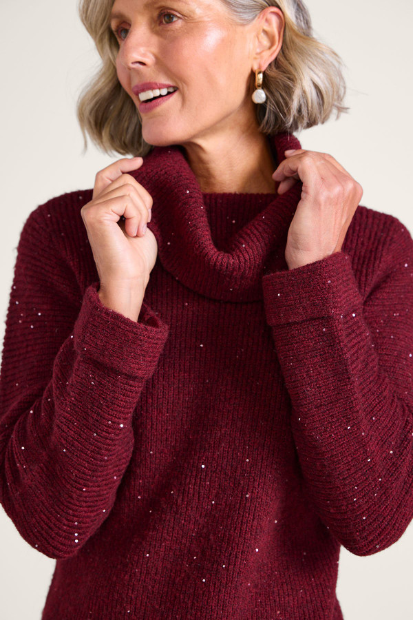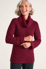 Dusted with silver micro sequins, this cowl sweater is slouchy and oh-so-soft. Vertical ribs on the body contrast with horizontally ribbed sleeves for fabulous texture, while the rich color is perfect for cool season outfitting.