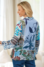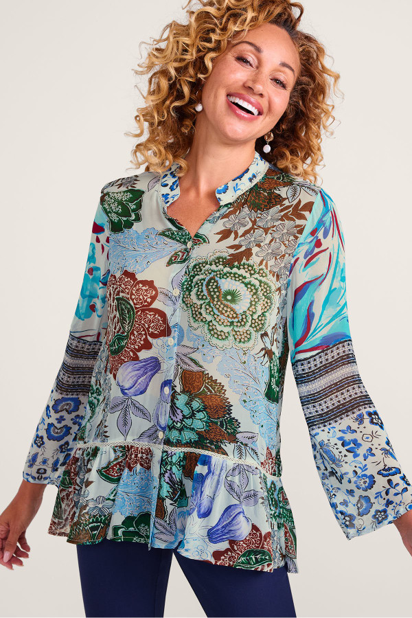 Our button-front blouse features a distinctive mix of fabrics and prints in lightweight, drapey crepe. The bracelet-length sleeves, crochet-trimmed seams, ruffle hem, and cotton voile back panel create artful detailing.