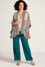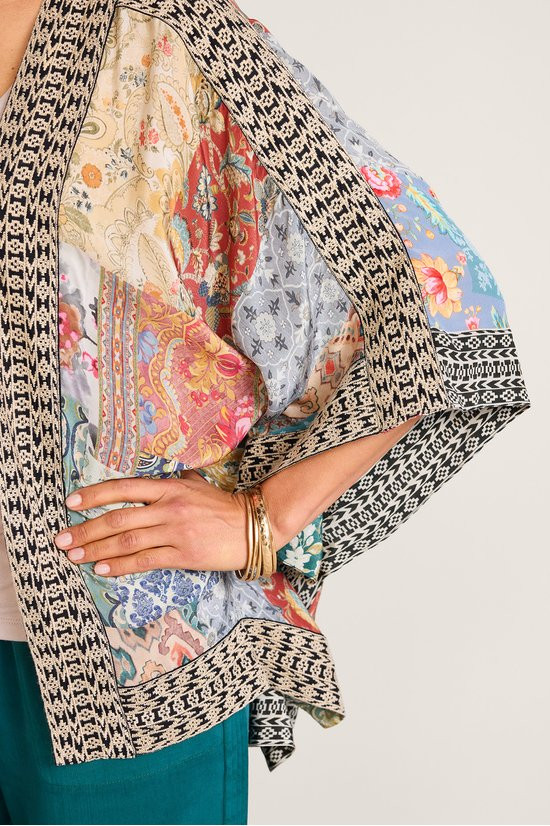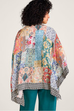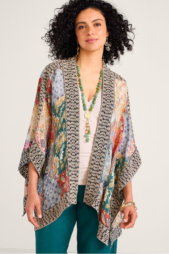 Crafted in a carefree crepe, this on-trend topper features a colorful patch print and embroidered contrast trim for instant intrigue. The relaxed fit and billowy 3/4 sleeves allow for effortless layering.