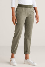 These utility crop pants in soft-washed midweight twill feature convertible styling with adjustable roll-tab hems. Wear them full length or cropped to suit the day. The ribbed knit elastic waist with faux fly ensures a comfortable fit at your natural waist, while front and back pockets and a straight-leg cut provide classic styling.