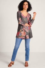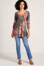 A cascade of roses adds feminine artistry to this high-low knit top. V-neck with long sleeves.