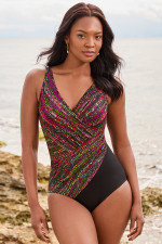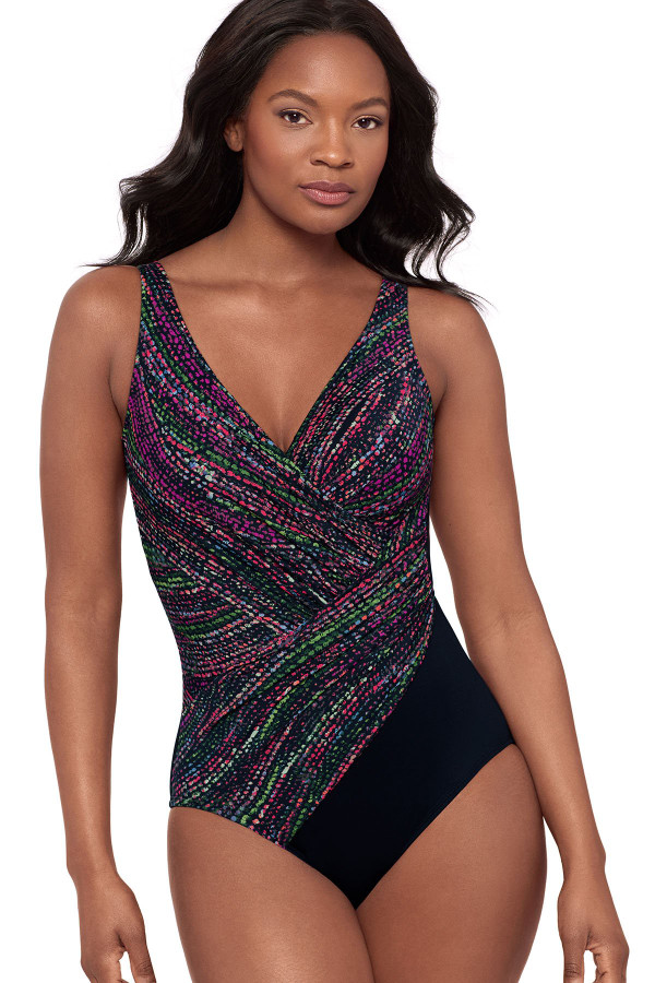 Slimming one-piece swimsuit features Miratex fabric that provides allover control to shape and slim your silhouette. This figure-flattering swimsuit showcases a surplice V-neckline with strategic front draping that shapes the waist and conceals the tummy. Soft cups and adjustable straps offer customizable lift and support for all-day comfort.