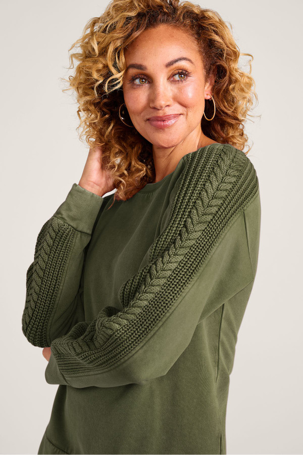 Our mixed media cable sleeve sweatshirt combines soft-washed, midweight fleece with cabled sweater-knit sleeves. The refined design brings depth while maintaining a comfortable, relaxed feel you can wear all day. Works for weekend activities or casual weekdays, pairing easily with jeans or joggers.
