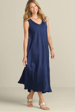 This sleeveless maxi dress features distinctive broomstick pleating that creates crinkled texture. The lightweight fabric offers warm-weather comfort while side seam pockets add convenience. A curved high-low hem with center back slit provides easy movement. Back keyhole button closure.