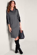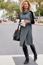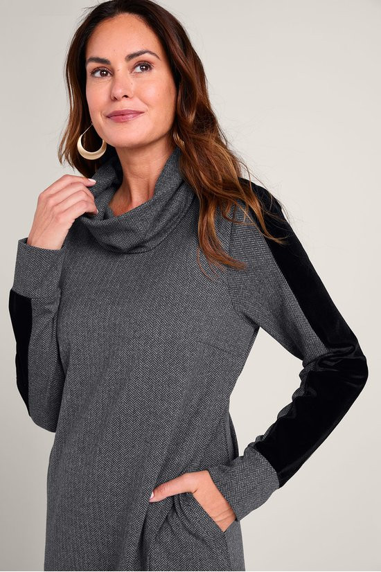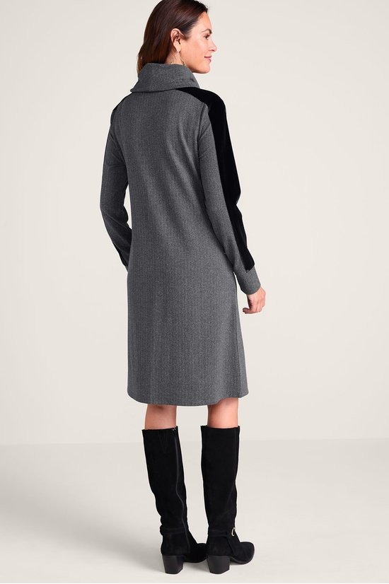 In a comfort-first herringbone knit, this dress flatters with an angled faux-wrap overlay and velvet-trimmed long sleeves with thumb openings. The cowl neck, pockets and knee-length hem make it easy to wear.