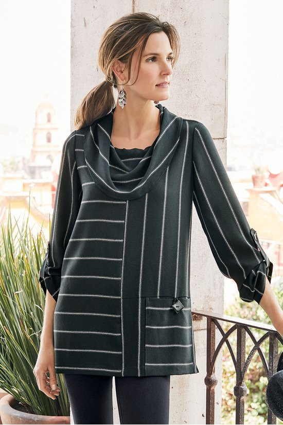 Our multi-directional pinstripe print top with relaxed cowl neck, single buttoned front patch pocket, roll-tab long sleeves and side slits.