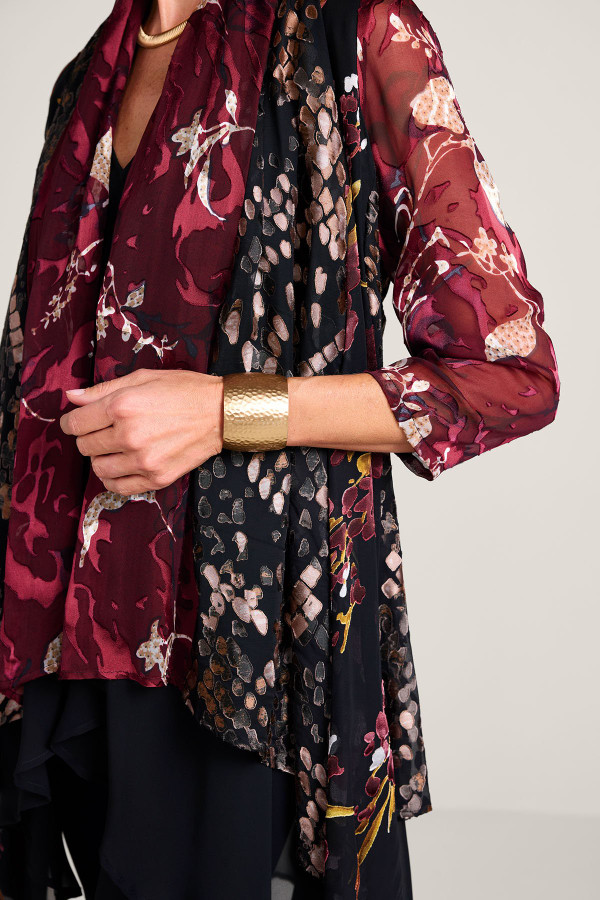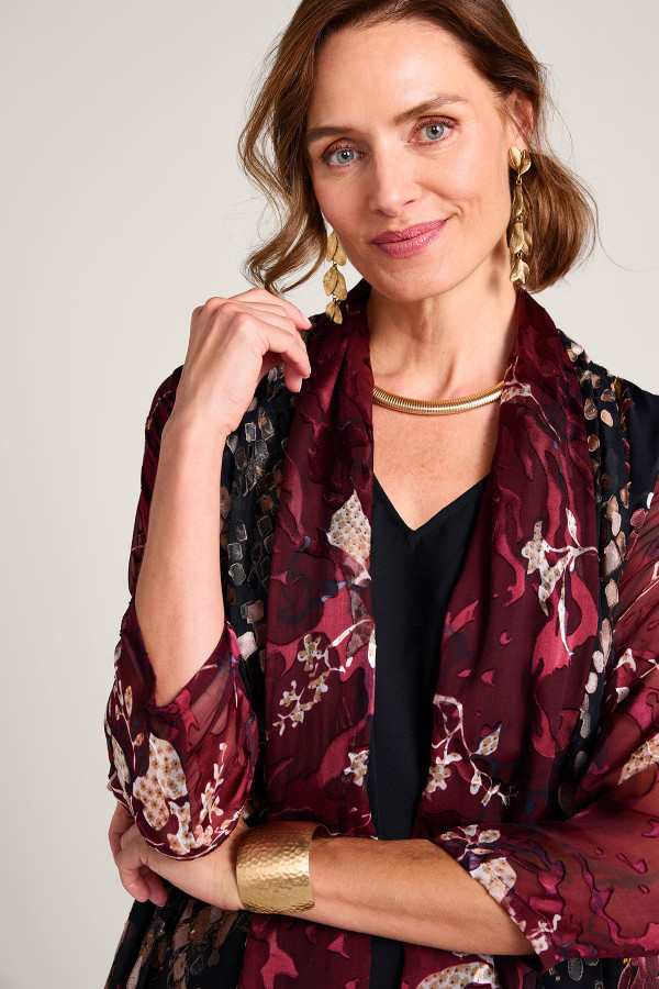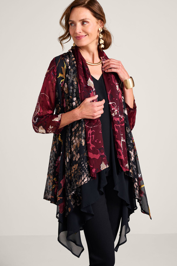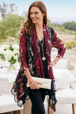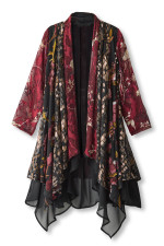A sheer burnout topper lets your confidence shine through. Multi-dimensional textures, colors, and prints create visual depth as they flow from the shawl collar to the handkerchief hem. The open-front design and 3/4-length sleeves offer effortless styling versatility, making this artistic piece perfect for layering over your favorite tanks, tops, or dresses.