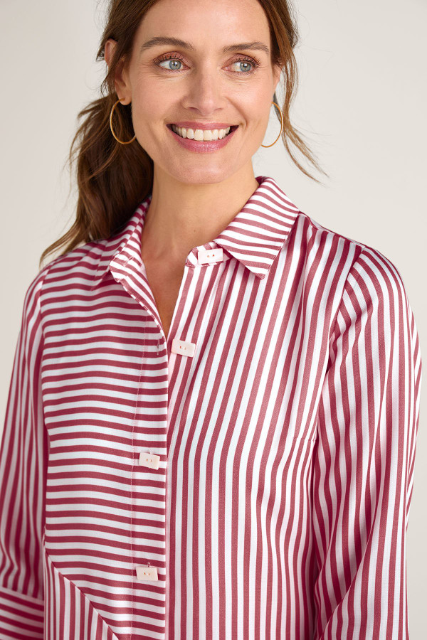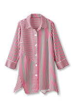 This softly draping shirt features multi-directional stripes and seaming that create a flattering silhouette on fluid TENCEL™ lyocell. A novelty button placket, faux back button placket, cuff-ready 3/4 sleeves, and an asymmetrical high-low hem add unique detail. TENCEL™ is a trademark of Lenzing AG.