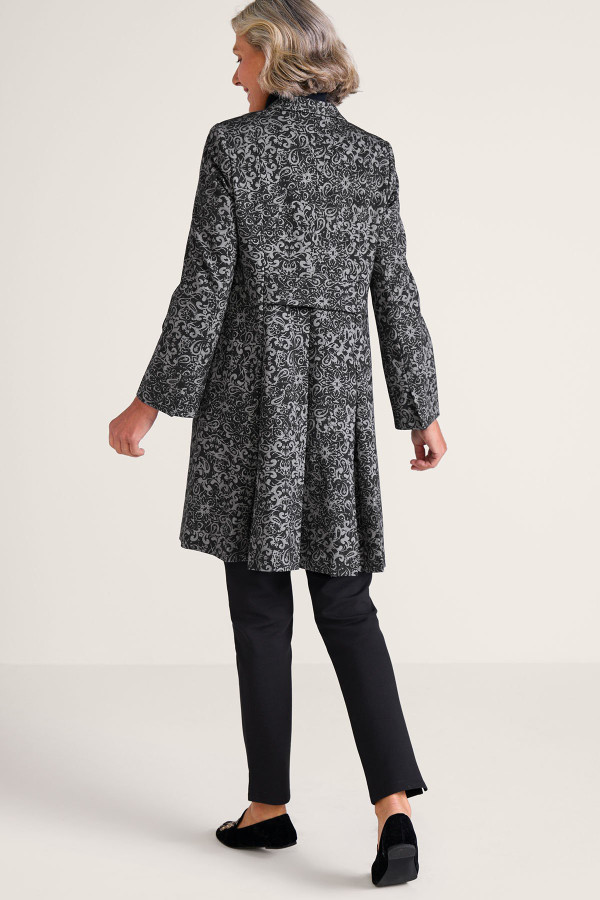 This midweight ponte stretch knit coat is refined with a scroll print and gently shaped by princess seams and a belt at the back waist. Inverted pleats add a touch of swing to the lower back, while slits at the bracelet-length sleeves allow for easy cuffing. Designed with a stand collar, hook-and-eye closure, welt pockets, and a full jacquard lining.