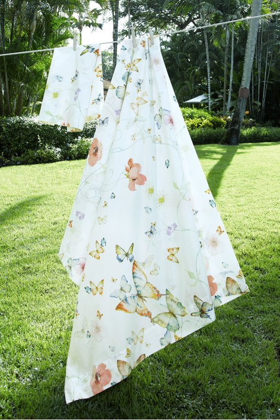 Hundreds of butterflies flutter amongst a garden of poppies and daisies, bringing with them the promise of warmer days. Printed in Italy on smooth, 200-thread-count cotton percale that's been washed for a sublimely soft hand, the sheet set includes a flat sheet, fitted sheet and pillow cases (two standard cases with queen set; two king cases with king set). 16" pocket depth.- 100% cotton