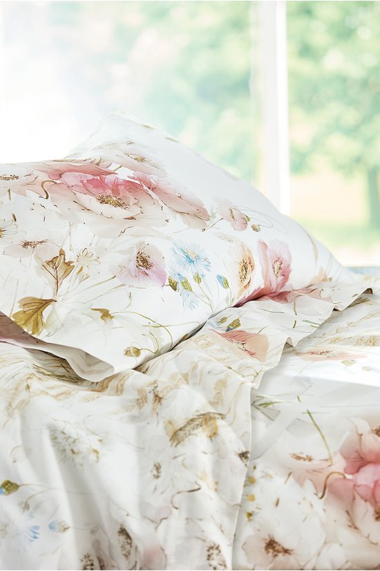Colorful poppies, wildflowers and wheat stalks dapple the bed a palette of bright watercolor hues. Printed exclusively for us in Italy on smooth, premium cotton percale that's been washed for a heavenly soft hand, the set includes a flat and fitted sheet plus pillowcases (two standard cases with queen set; two king cases with king set).